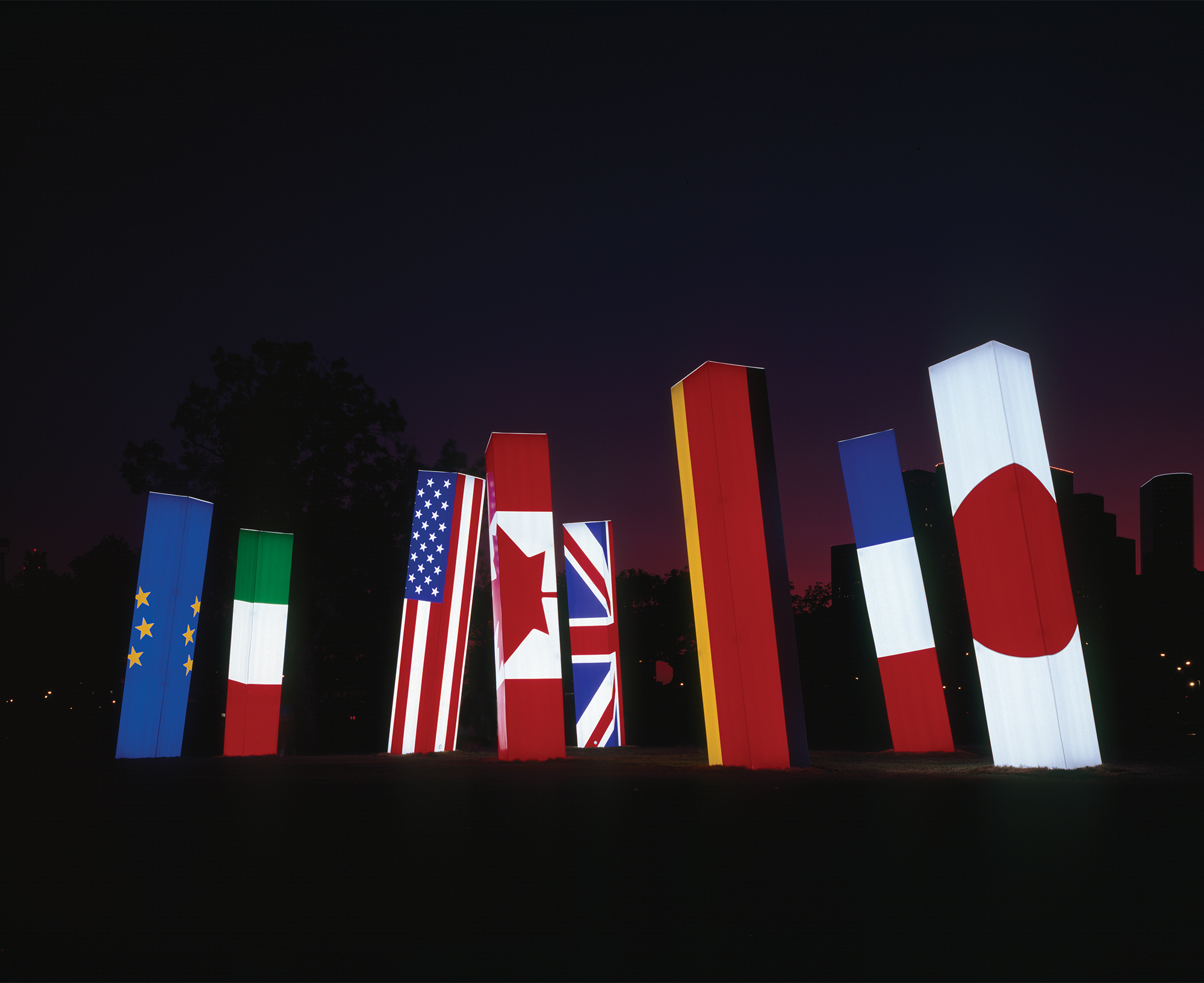 The Light Spikes were created for the G7 Summit held in Houston during the summer of 1990. Although some people believe that they were commissioned for the Summit, the truth is that they were volunteered for the event. Initially, I envisioned illuminated flag columns placed all over Houston: in esplanades, on buildings, at the Mecom Fountain, at the Water Wall adjacent to Transco Tower, and at Rice University. The idea owed a lot to Christo. I created colored paper collages on black-and-white photographs to describe the idea to anyone who would listen.Through the invitation of colleagues, I attended regular meetings of the Host Committee. It was co-chaired by Ken Lay and George Strake, Jr. Committee meetings took place at Transco around a table seating some 100 people. After weeks of presenting the idea, I was summoned to a small meeting of the Host Committee. Ken Lay asked me to explain what these “Light Spikes” were. I don’t remember precisely what I told the Host Committee, but my basic message was that the Light Spikes were intended as a sculptural welcome. He said that the location would be the lawn in front of the George R. Brown Convention Center, that he would allocate $40,000, and that I would be on my own for the rest.