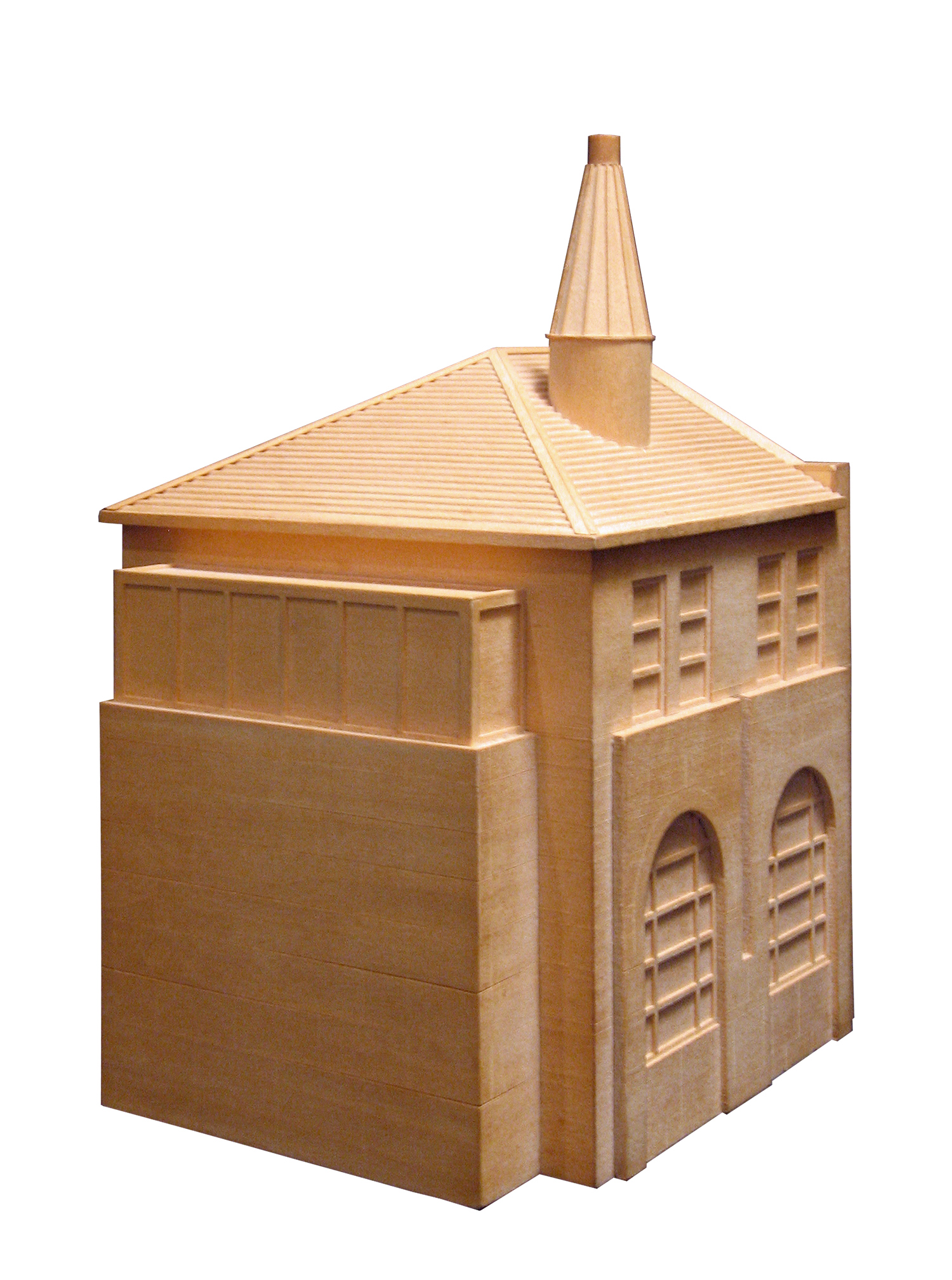 To craft the toy, we started with a traditional jack-in-the-box, then clad it in basswood panels to echo the facades and rooflines of Stirling’s design. The original clown inside was replaced with a winged cube adorned with photographs of Dean Mitchell.