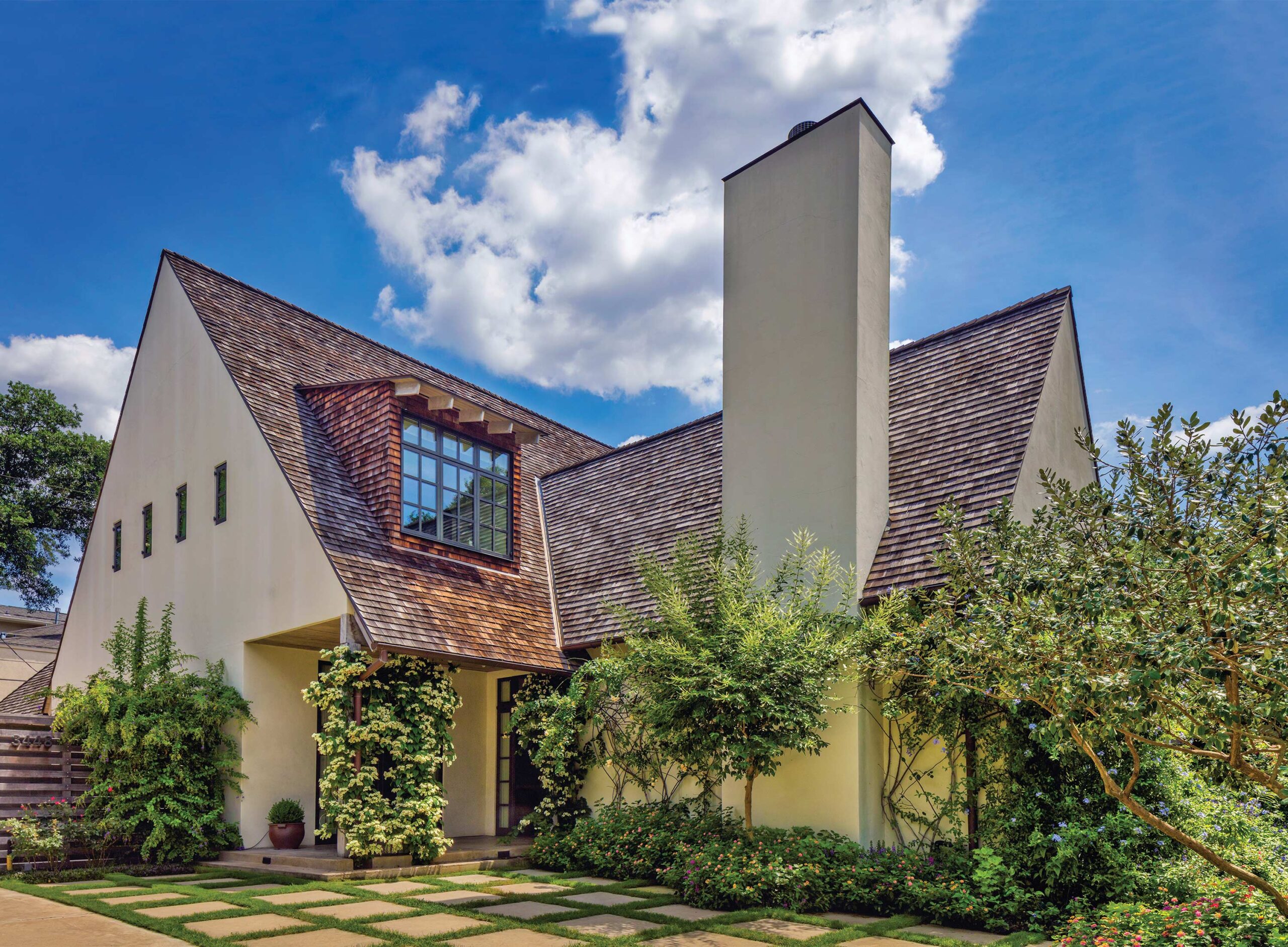 From the street, the gable roof rises directly from the first floor, giving the house a modest and respectful scale. The upper level—containing bedrooms and a library—is tucked within a composition of dormers. These dormers, clad in the same cedar shingles as the roof, blend into the larger roof plane, appearing as integral elements rather than added features.